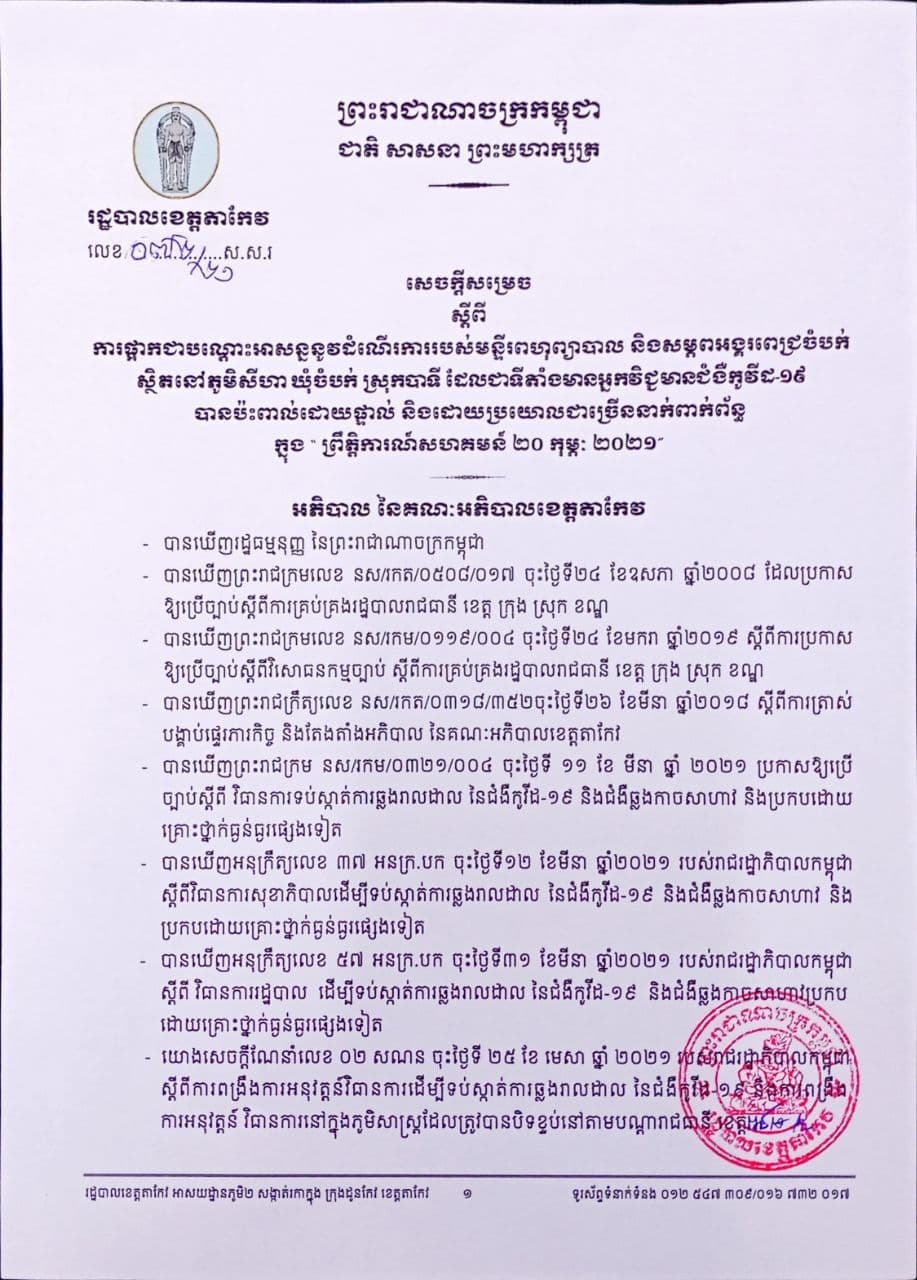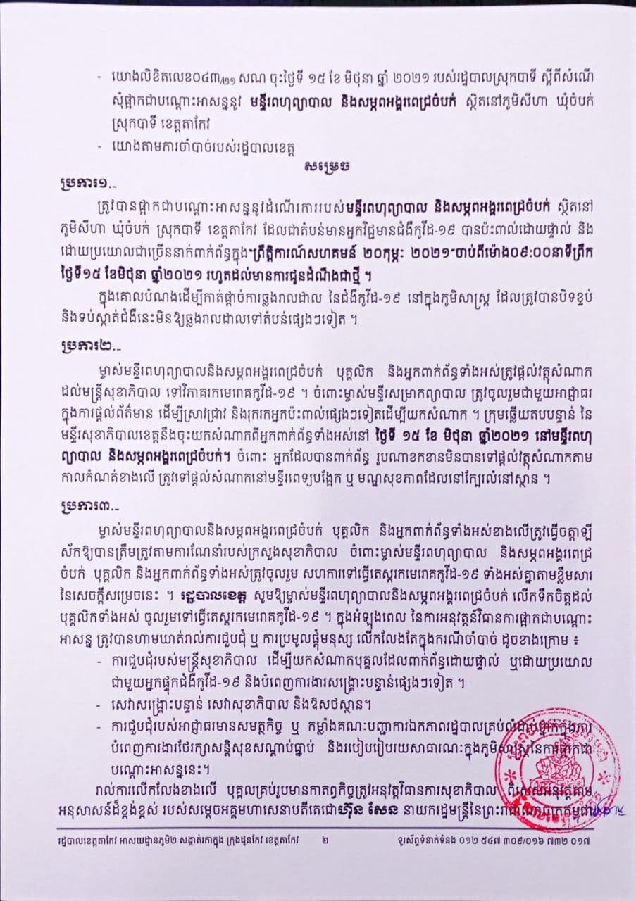 តាកែវ៖ រដ្ឋបាលខេត្តតាកែវ បានចេញសេចក្តីសម្រេច ផ្អាកជាបណ្តោះអាសន្ន នូវដំណើរការរបស់ មន្ទីរពហុព្យបាល និងសម្ភពអង្គរពេជ្រចំបក់ ដែលមានទីតាំងនៅភូមិ សីហា ឃុំចំបក់ស្រុកបាទី ដែលជាទីតាំង មានអ្នកវិជ្ជមានកូវីដ១៩ បានប៉ះពាល់ផ្ទាល់ និងដោយប្រយោលជាច្រើននាក់ ដែលបានពាក់ព័ន្ធក្នុង ព្រឹត្តិការណ៍សហគមន៍ ២០ កុម្ភៈ ២០២១ ចាប់ពីម៉ោង ៩ព្រឹក ថ្ងៃទី១៥ ខែមិថុនា ឆ្នាំ២០២១ រហូតដល់មានការជូនដំណឹងសារជាថ្មី។ នេះដែលយោងតាមលិខិត ជូនដំណឹងរបស់ រដ្ឋបាលខេត្តតាកែវ ដែលអង្គភាពព័ត៌មាន PKA ទទួលបាននៅល្ងាចថ្ងៃទី១៥ ខែមិថុនានេះ។
